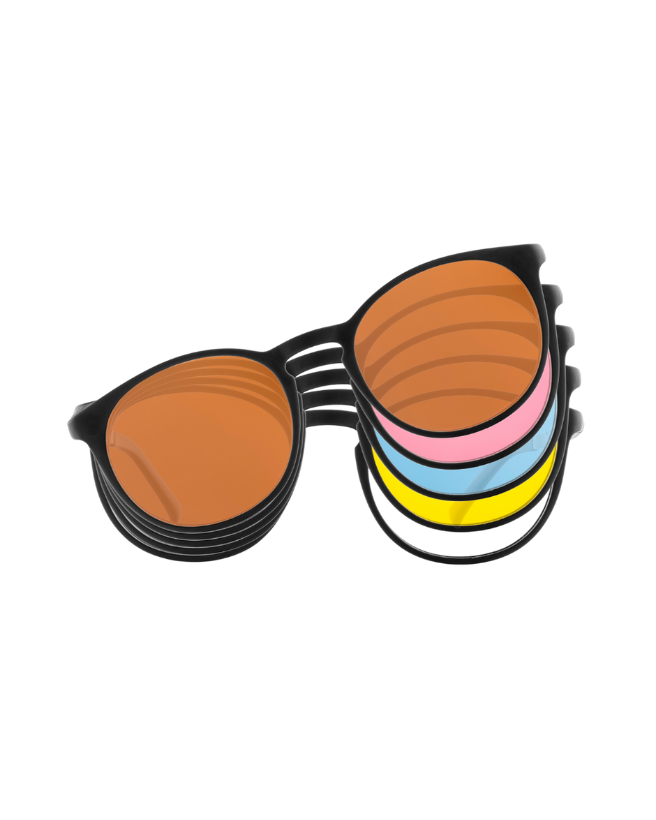 Gracias a imanes ocultos, cambia los clip-ons de color en un instante. Resistente a impactos, dobleces, agua y temperaturas extremas sin deformarse. Coloca tu prescripción e intercambia entre 4 diferentes colores instantáneamente.